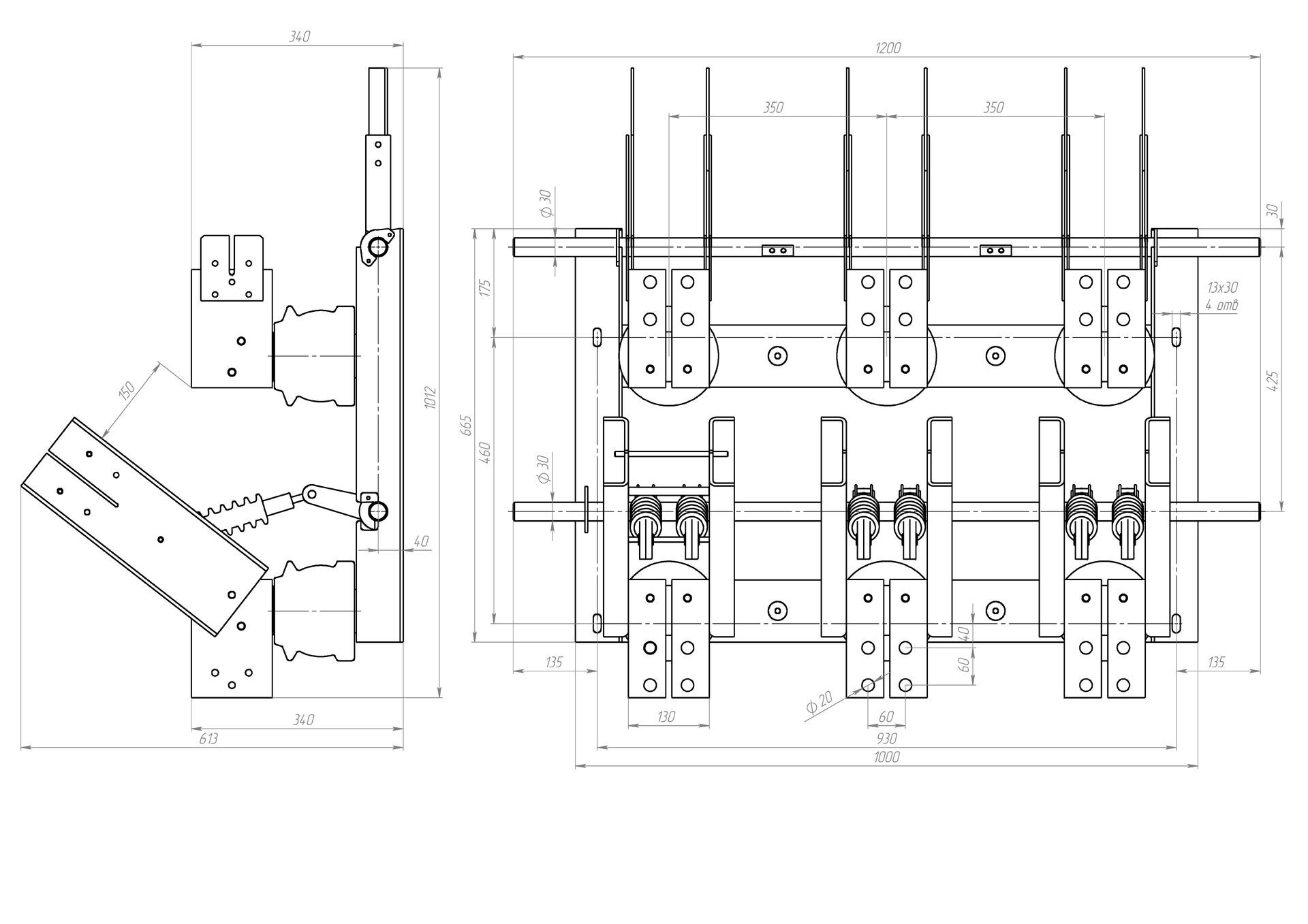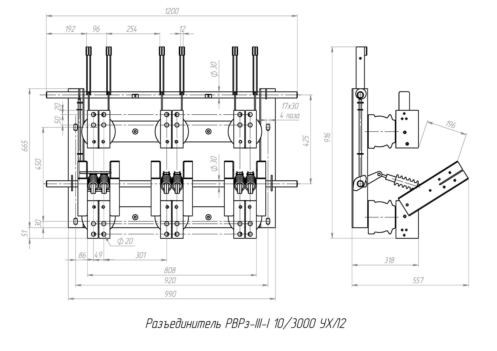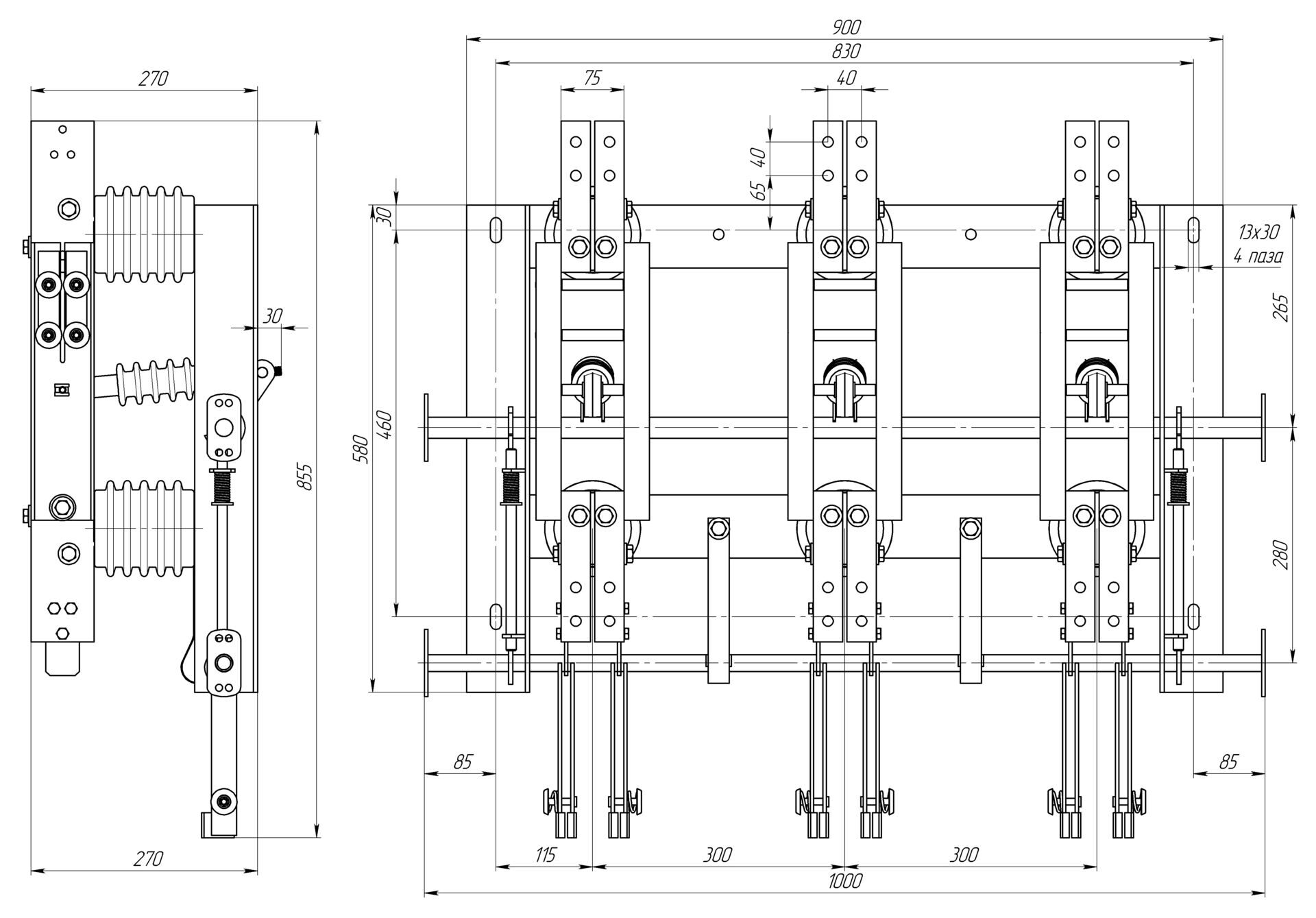 Разъединитель трехполюсный, заземляющие ножи со стороны подвижного контакта.