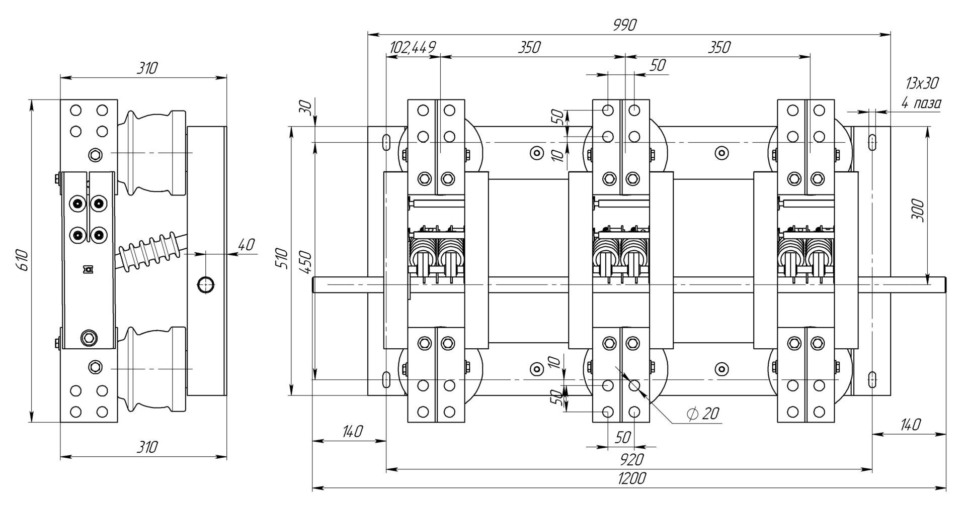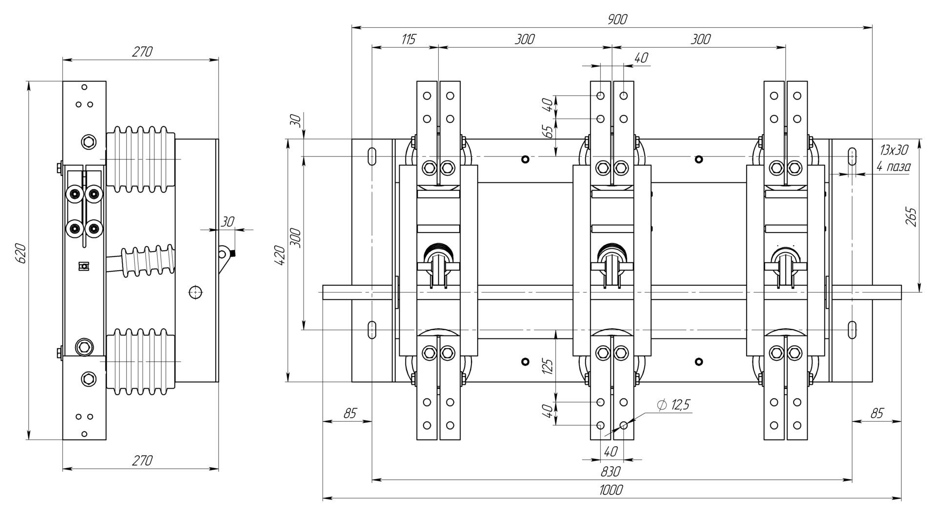 Разъединитель трехполюсный, заземляющие ножи с двух сторон.