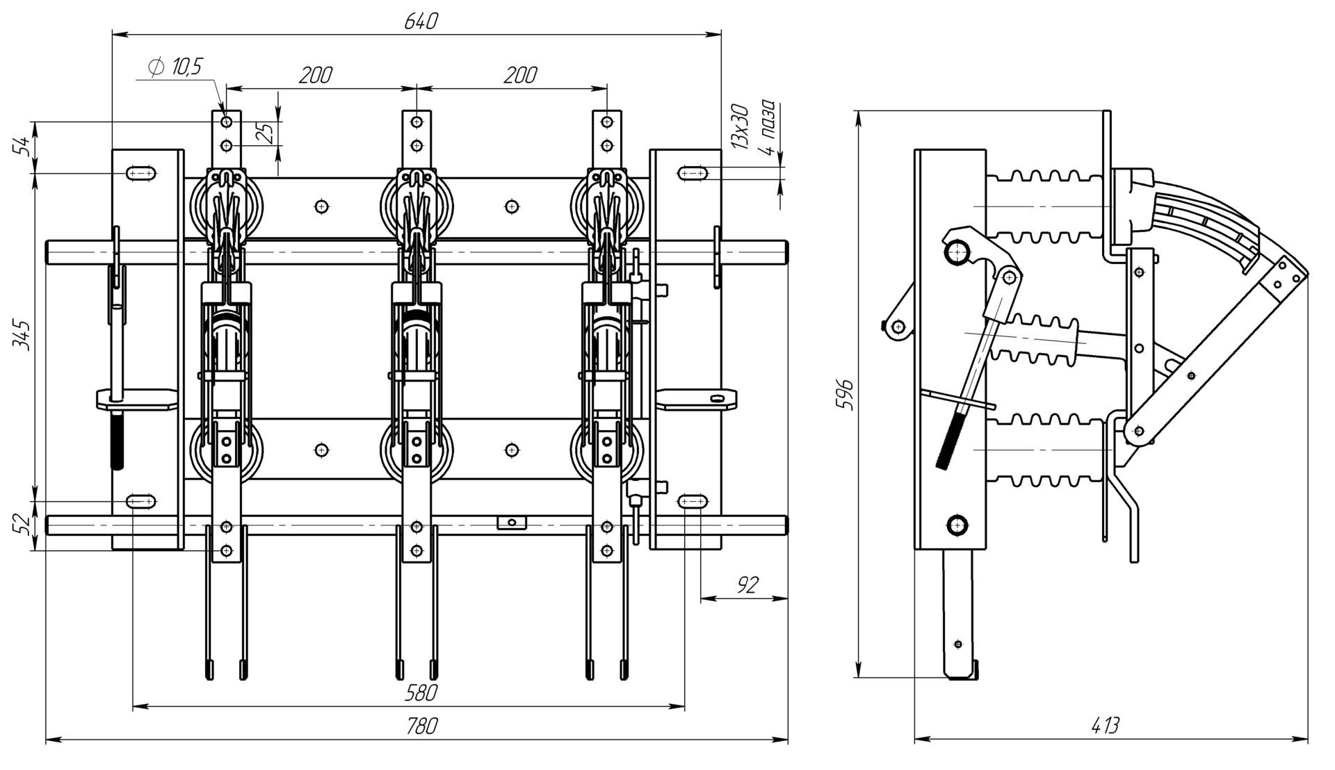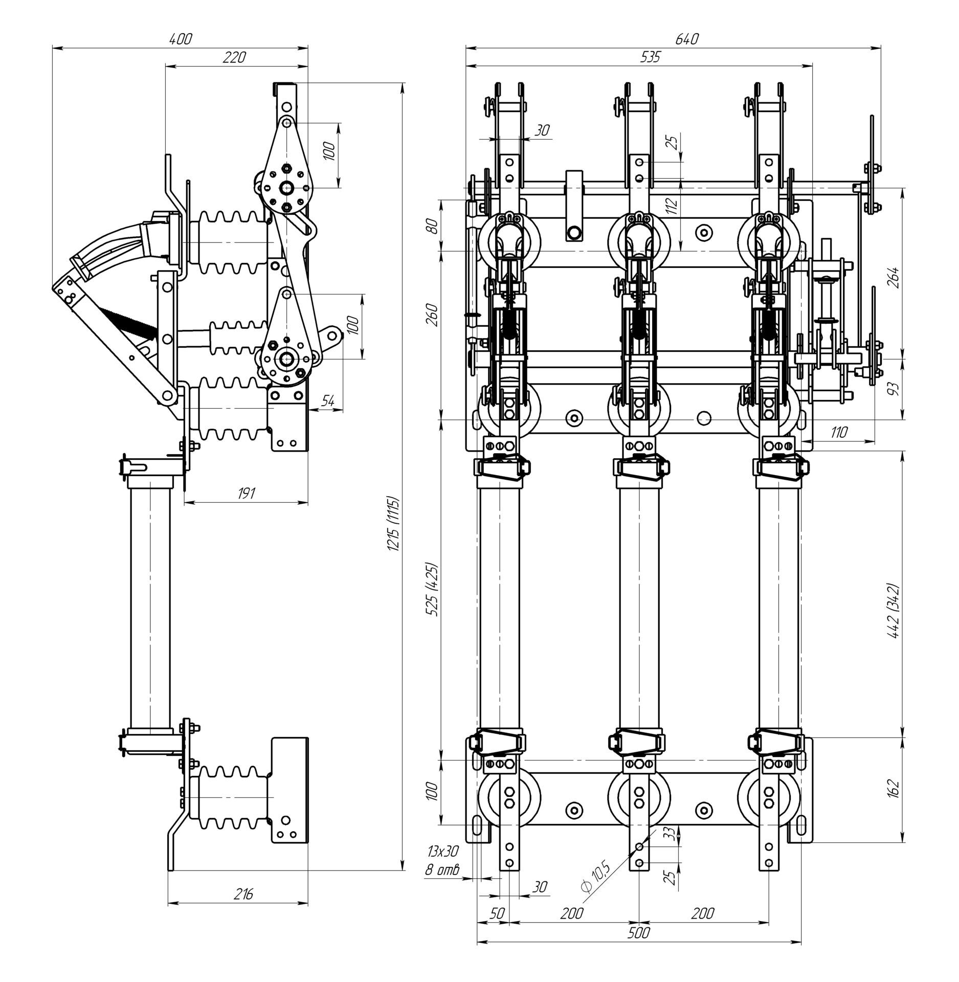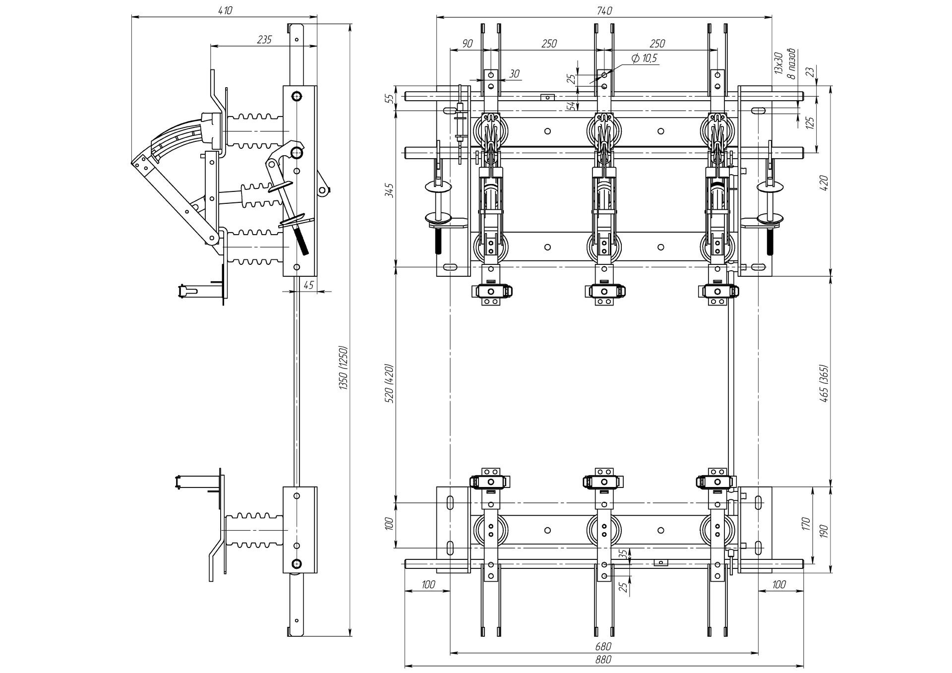 Выключатель нагрузки с правосторонним приводом и полурамой для установки предохранителей серии ПТ. Заземляющие ножи со стороны подвижных и не подвижных контактов.