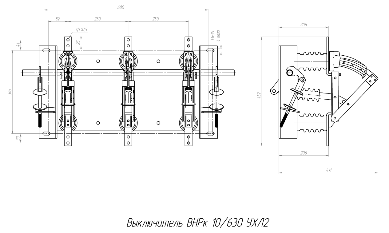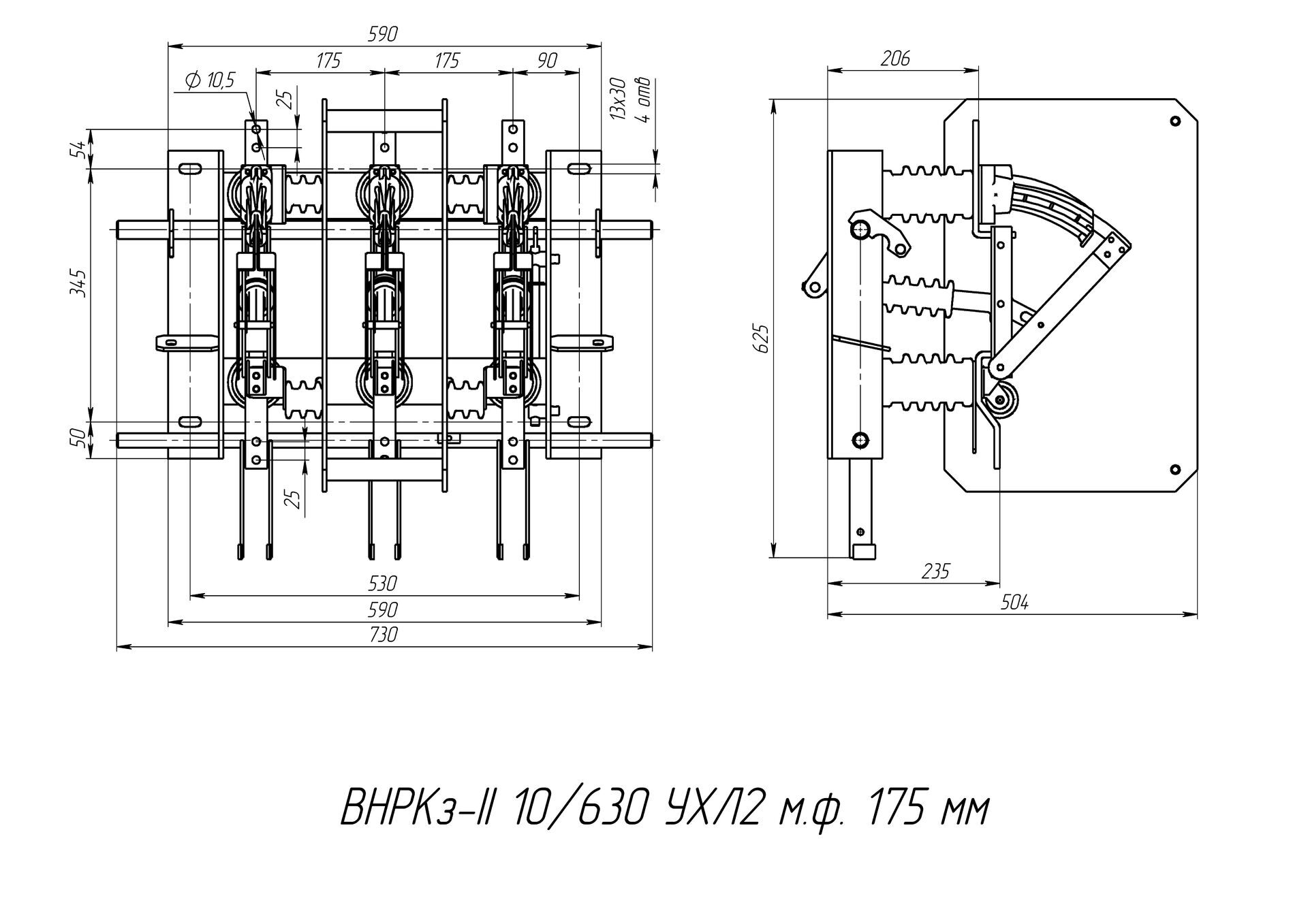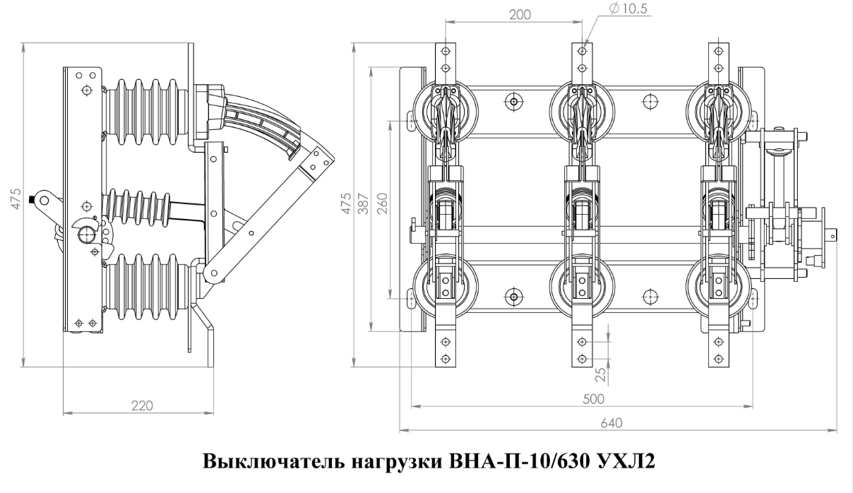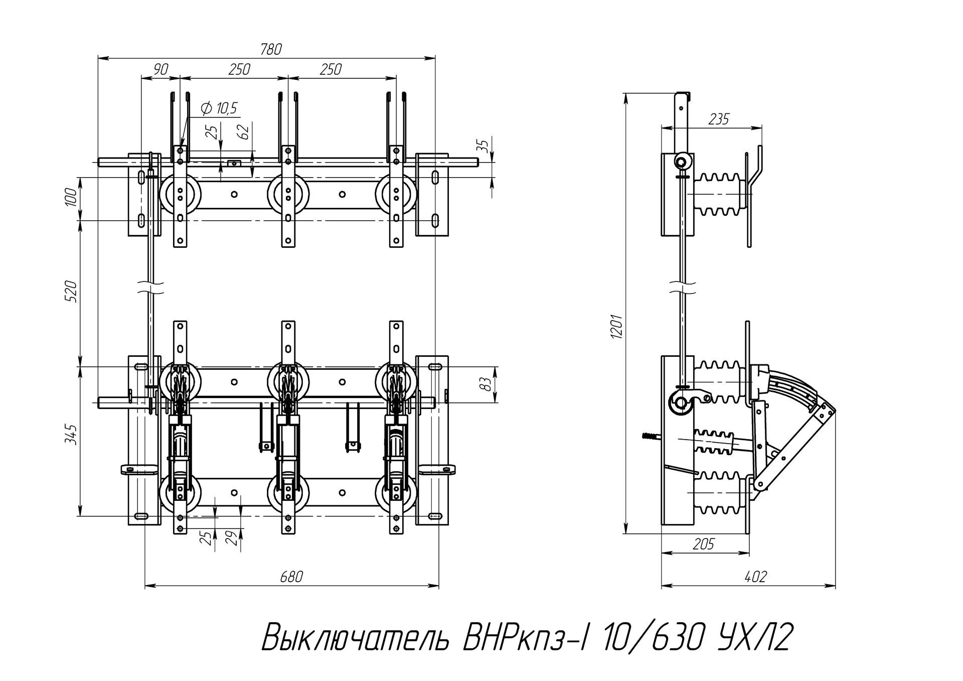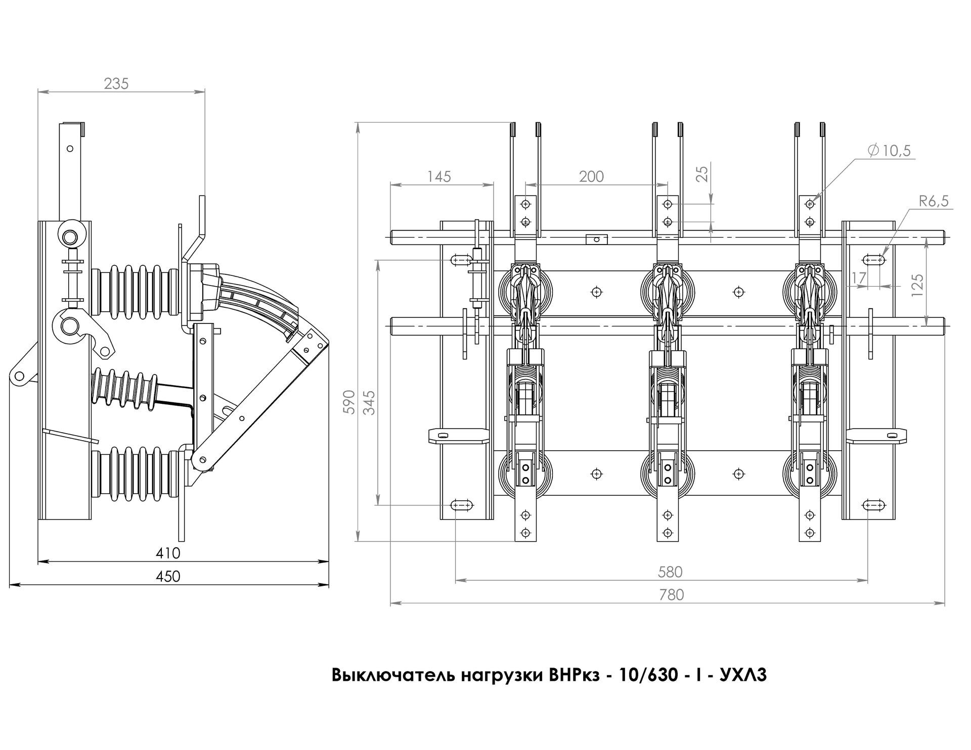 Выключатель нагрузки с дугогасительными камерами из полиметилметакрилата. Предназначен для отключения токовых цепей напряжением 10 кВ. под нагрузкой и защиты присоединения предохранителями серии ПТ. Гашение дуги происходит в полимерной камере за счет продуктов горения материала камеры и скорости отключения. Исполнение с заземляющими ножами или без заземляющих ножей. С заземляющими ножами возможно три исполнения. I - заземляющие ножи со стороны разъемного контакта. II - заземляющие ножи со стороны шарнирного соединения подвижного контакта. III - заземляющие ножи с двух сторон выключателя