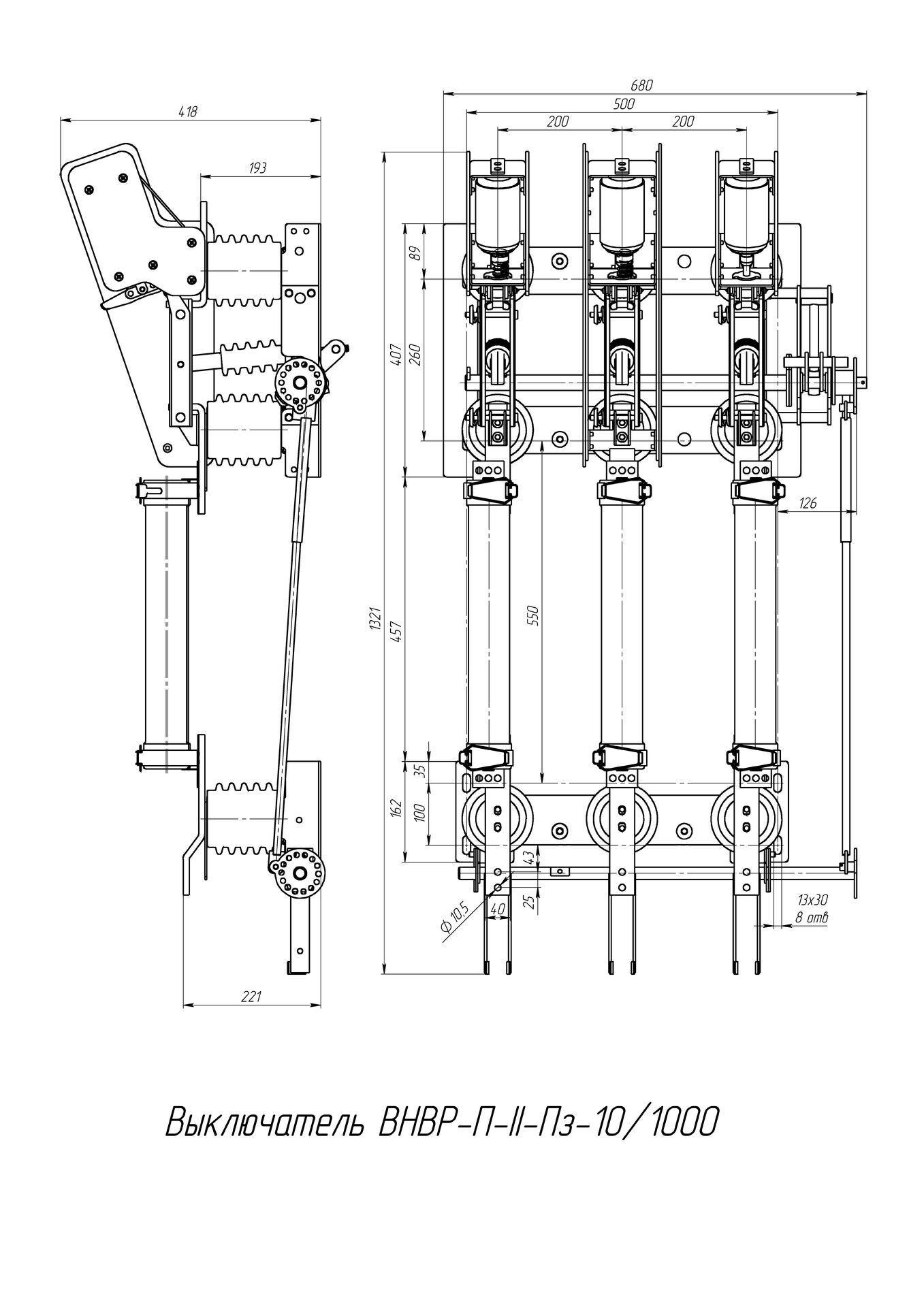 Выключатель нагрузки с вакуумными дугогасительными камерами. Предназначен для отключения токовых цепей напряжением 10 кВ. под нагрузкой. Гашение дуги происходит в безвоздушной среде вакуумной камеры. Исполнение с заземляющими ножами или без заземляющих ножей. С заземляющими ножами возможно три исполнения. I - заземляющие ножи со стороны разъемного контакта. II - заземляющие ножи со стороны шарнирного соединения подвижного контакта. III - заземляющие ножи с двух сторон выключателя